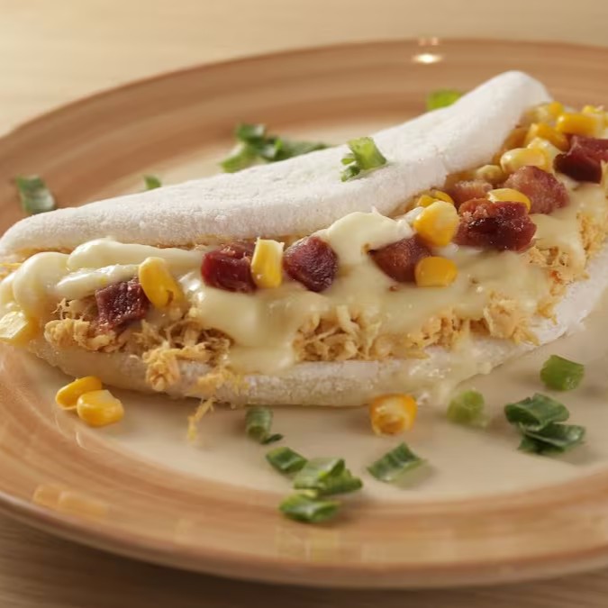 Maravilhosa massa artesanal de crepioca, recheada com frango desfiado, mussarela derretido, Catupiry Original , milho e bacons crocantes podendo adicionar mais itens nos adicionais.