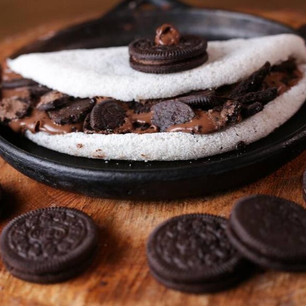 Maravilhosa massa artesanal bem recheada com Nutella em quantidade generosa acompanhada por biscoitos Oreo.