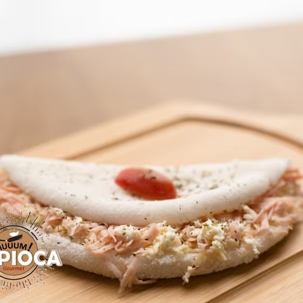 Apresentamos a 'Tapioca Caipira', um deleite exclusivo da categoria 'Tapiocas Premium'. Esta maravilha é feita com uma massa artesanal irresistível, generosamente recheada com frango desfiado suculento, que se une harmoniosamente ao Catupiry Original, conferindo cremosidade ao prato. A mussarela derretida adiciona uma camada de sabor que desperta os sentidos, enquanto os pedaços de bacon crocante prometem uma surpresa a cada mordida. O toque final fica por conta do milho, adicionando uma doçura sutil. Uma verdadeira experiência gastronômica que encanta tanto pelo sabor quanto pela apresentação.