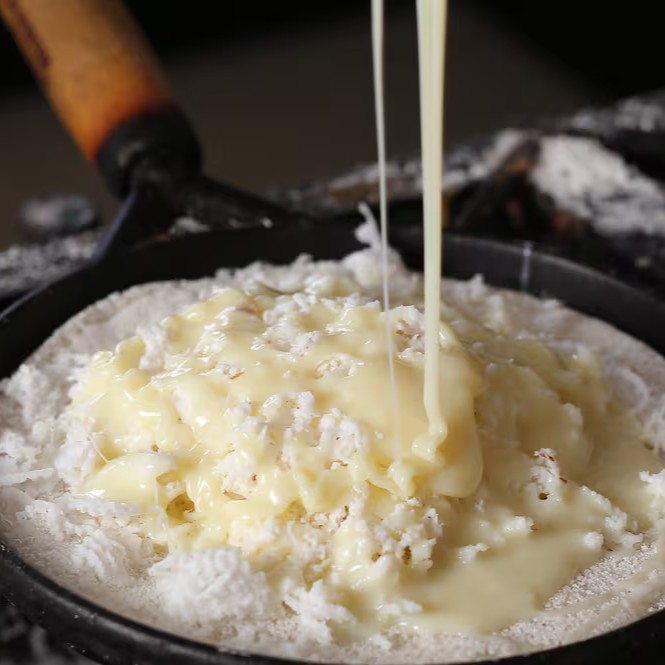 Delicioso coco fresco raspado na hora com leite condensado de primeira qualidade.