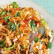 macarrão de yakissoba grelhado na chapa, molho shoyo, cenoura, cebola, brócolis e repolho. CARNE DE FRANGO