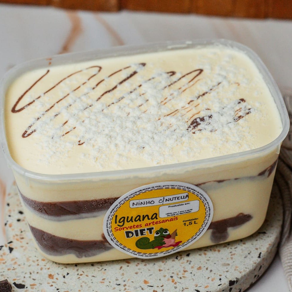 Delicioso sorvete artesanal, produzido com insumos de altíssima qualidade, massa sabor chocolate com avelã mesclado com trufa de leite Ninho