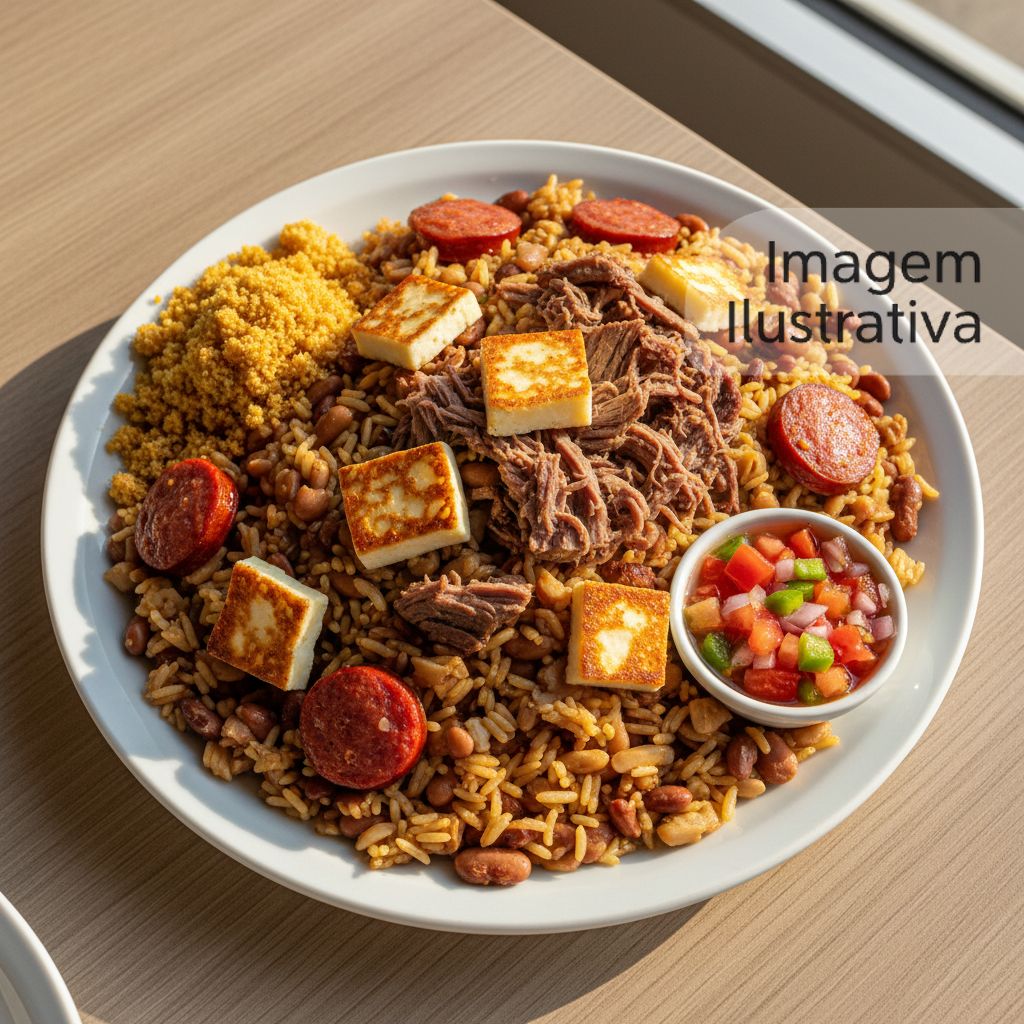Inclui baião de dois com linguiça, queijo coalho, carne de sol, e uma porção de farofa e vinagrete.