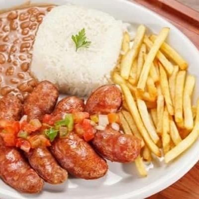 Arroz branco, feijão, fritas, salada