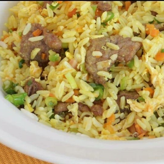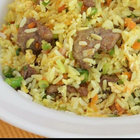 Tradicional risoto chinês com filetes de carne com novo tempero ao molho curry ,levemente picante .