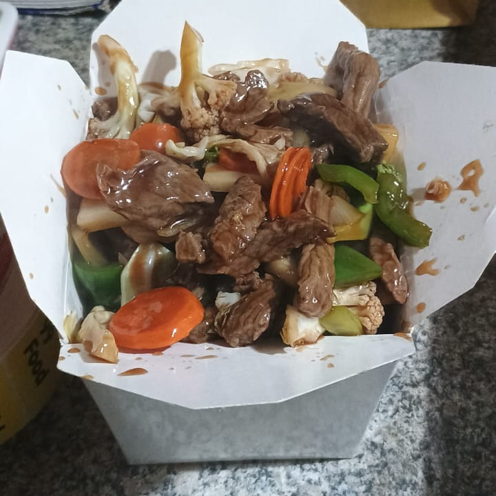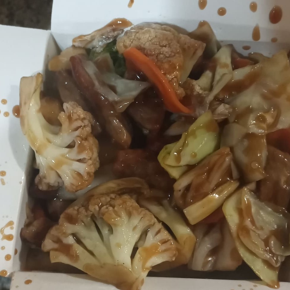 Carne fatiada ,repolho, brócolis, cenoura, couve flor e pimentão no molho de soja.