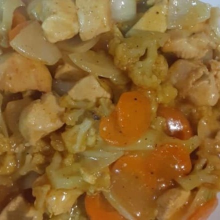 Sabor apimentado tem suas origens na comida indiana os cubos de frango com couve-flor e cebola e cenoura . Venha fazer essa viagem ate india