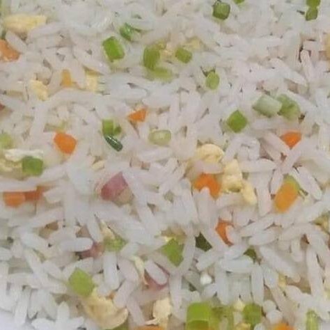 Arroz com Flocos de ovo ,cenoura, presunto, salpicado com cebolinha.