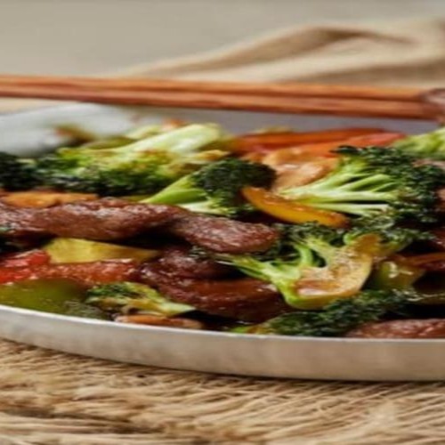 Carne fatiada, brócolis, pimentão, e no molho de soja.