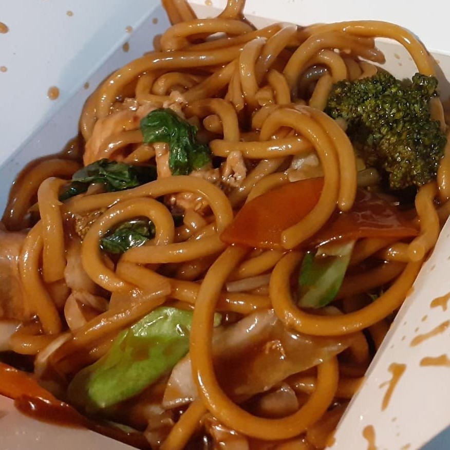Macarrão oriental com carne frango acompanhado por legumes fresco finalizado abase de shoyu e nosso tempero exclusivo.
