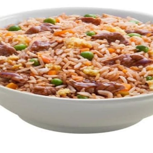 Risoto com carne bovina em tiras, cenoura, ovo presunto.