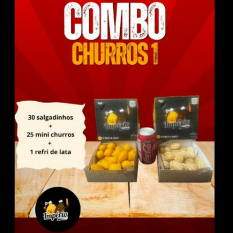 50 unidades mini salgados+ 25 unidades churros + 1 refri 1 litro