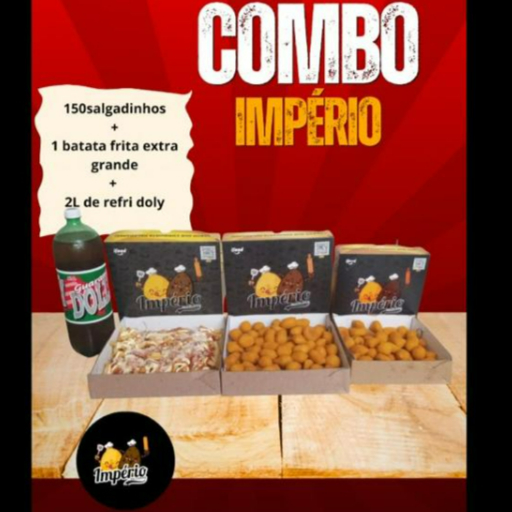 150 mini salgados,1 batata frita extra grande,1 refrigerante dolly, escolher:(ketchup, maionese, mostarda e queijo ralado) ou completo