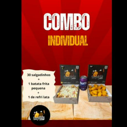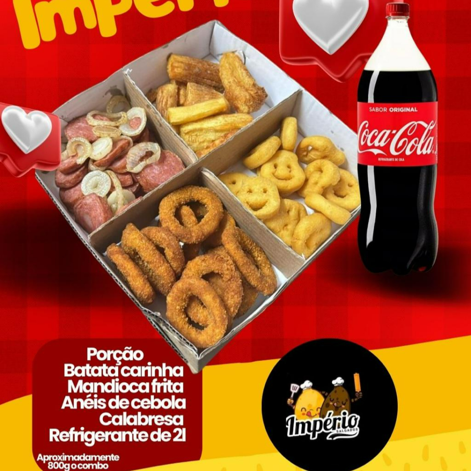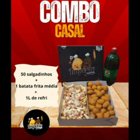 50 mini salgados,1 batata frita média, 1 refrigerante de 1 litros, escolher: ( ketchup, maionese, mostarda e queijo ralado) ou completo.