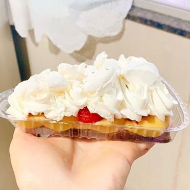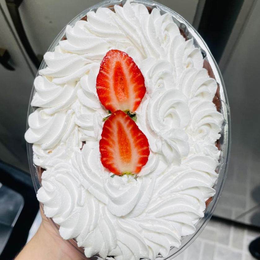 Uma fatia do nosso maravilhoso brownie, com brigadeiro de Ninho, pedaços de morango, chantilly e suspiro.
