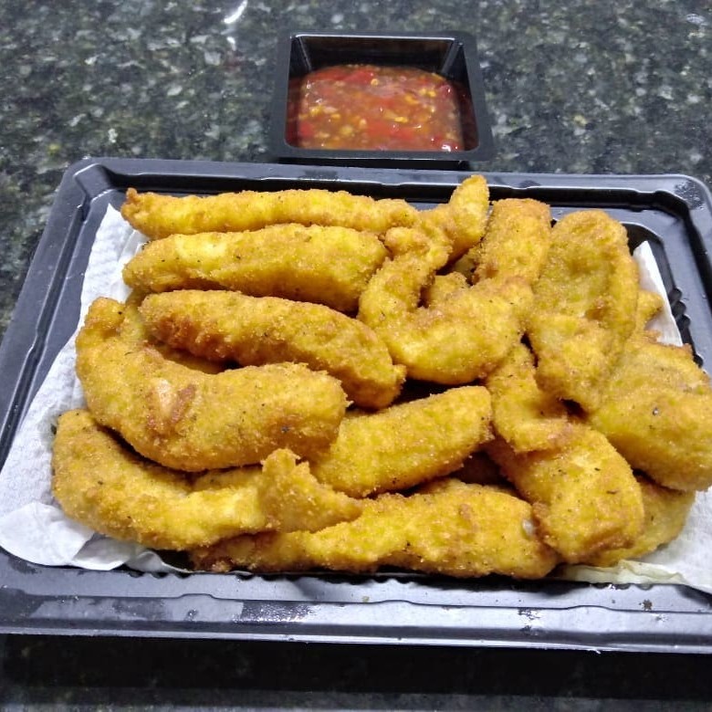 Tilapia em cubos empanado e fritos acompanha pimenta sweet chili