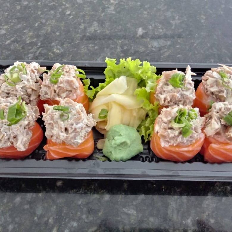 Uma verdadeira explosão de sabores.. Jyo Salmão feito com arroz japonês enrolado nas tiras de salmão e tartaki de salmão batido com cebolinha. Serve bem 1 pessoa Todos os nossos produtos são selecionados e manipulados diariamente!