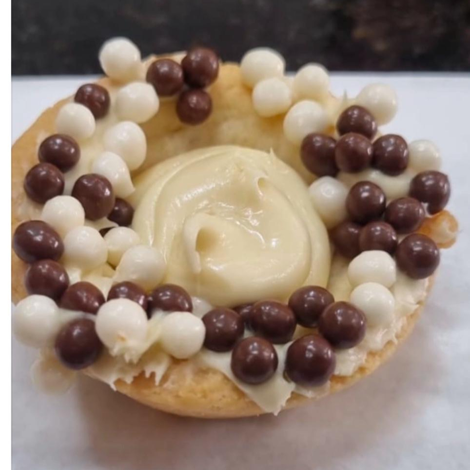 empada doce recheada de creme de chocolate branco e bolinhas crocantes