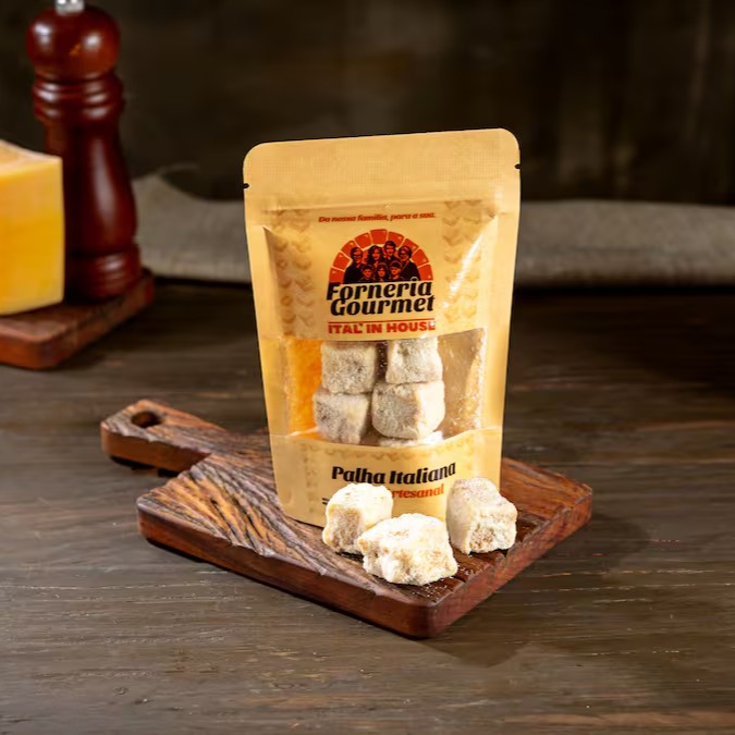 A palha italiana é uma sobremesa clássica e envolvente, feita com chocolate branco e pedaços de biscoito, finalizada com uma generosa camada de leite em pó. Combina cremosidade e crocância em cada mordida. (aprox. 50g)