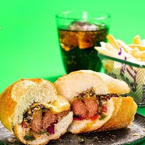 Choripan - pão francês fresquinho , incrível linguiça Plant Based (80 gramas ), vinagrete da casa e um toque marcante de chimichurri para finalizar .