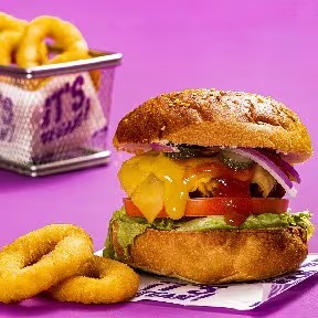 Delicioso burguer bem chapado (base de ervilha - pode conter glúten ) com delicioso cheddar, ketchup e mostarda.