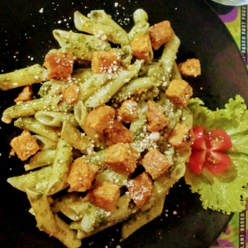 Nosso pesto é simplismente incrível, feito com nozes, manjericão e creme de leite vegetal. Queijo parmesão ralado delicioso e sua opção de frango ou linguiça ( ambos de proteína de ervilha)