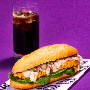 Incrivel receita Austriaca ! Delicioso filé de frango plant based empanado( base de ervilha) Baguete,cole slaw da chef (maionese de repolho rouxo,verde e cenoura) e rucula- acompanha Bebida e Fritas com opçoẽs de troca