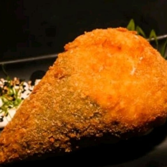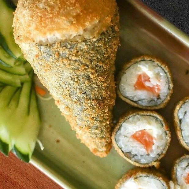 Enrolado de de arroz empanado na farinha panko e frito recheado com salmão grelhado finalizado com creme chees e cebolinha verde.