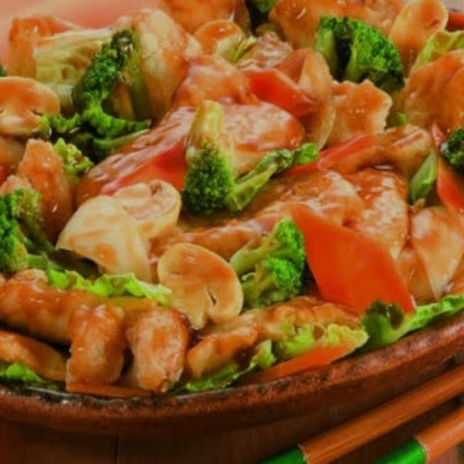 Acompanha cubos de peito de frango, pimentão verde, cebola, amendoim ao molho de soja.
