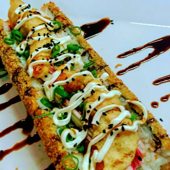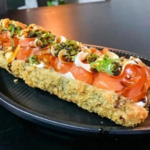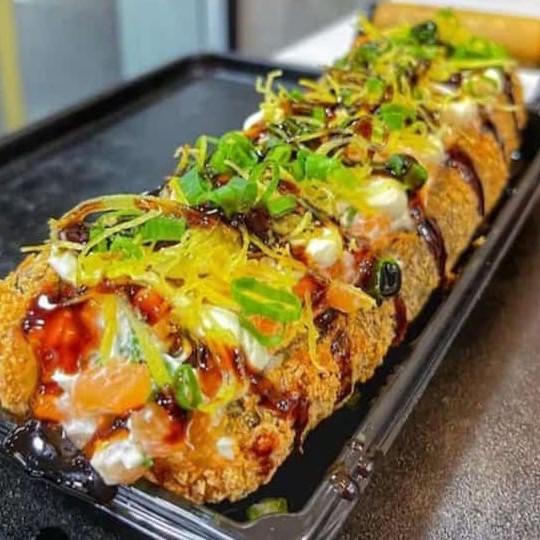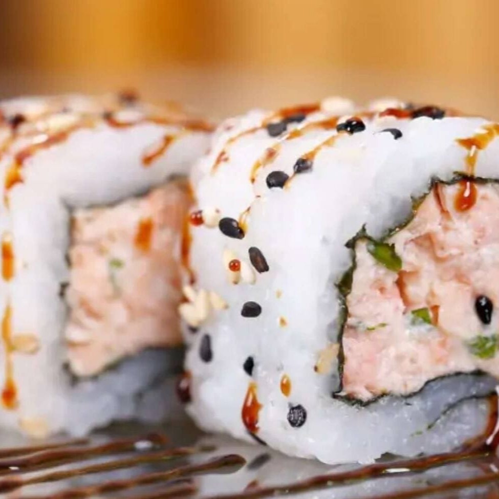 O 'Hot Roll Salmão e Cream Cheese' é uma deliciosa iguaria da culinária japonesa. Consiste em um sedutor enrolado de nori, meticulosamente recheado com um perfeitamente temperado arroz japonês, complementado com um generoso preenchimento de salmão fresco e cremoso cream cheese. Cada unidade é habilmente empanada na crocante farinha Panko, e então frita à perfeição. Como toque final, uma cobertura