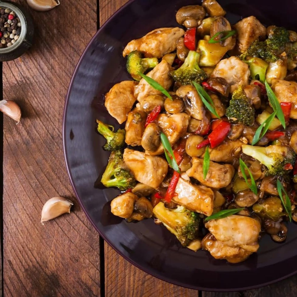 Acompanha cubos de peito de frango, pimentão verde, cebola e amendoim ao molho de soja