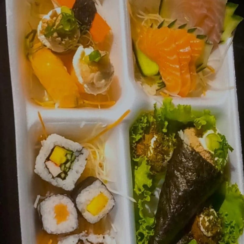 Pratos frios: 6 Sashimis (variados), 1 mini temaki, 2hot holl, 2 jhoy (variados), 2 niguiri (variados), 2 urumaki (variados) e 2 hossomaki (variados) Prato Quente: 1 Salmão Grelhado, 1 rolinho primavera, 1 rolinho de queijo, 1 Yakissoba (escolha a opção) e yakimeshi. (Todos os sushis são de sabores variados e sashimi salmão e tilápia)