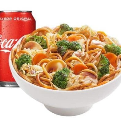 Macarrão oriental, carne, frango, brócolis, cenoura, acelga e molho shoyo + refrigerante 350ml