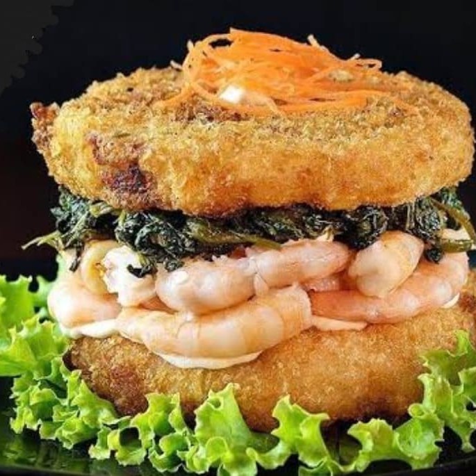 Deliciosamente único, o 'Burger Camarão' da categoria 'Burger Sushi' é uma experiência culinária que transforma a concepção de um prato clássico. O seu segredo está na base de arroz gohan meticulosamente empanado na crocante farinha panko, proporcionando uma textura inigualável. No coração deste prato, encontra-se um generoso recheio de camarão pré-cozido, que oferece um sabor marinho irresistível