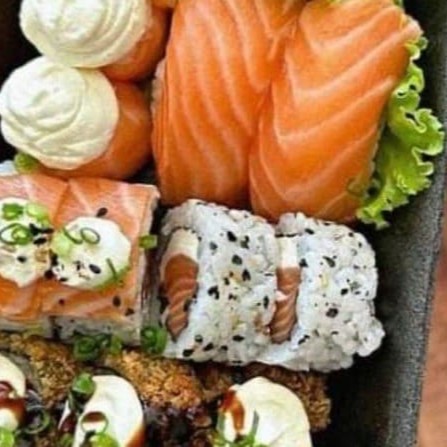 Arroz salmão cru ceviche kani sunomono creme cheese couve crisp batata doce