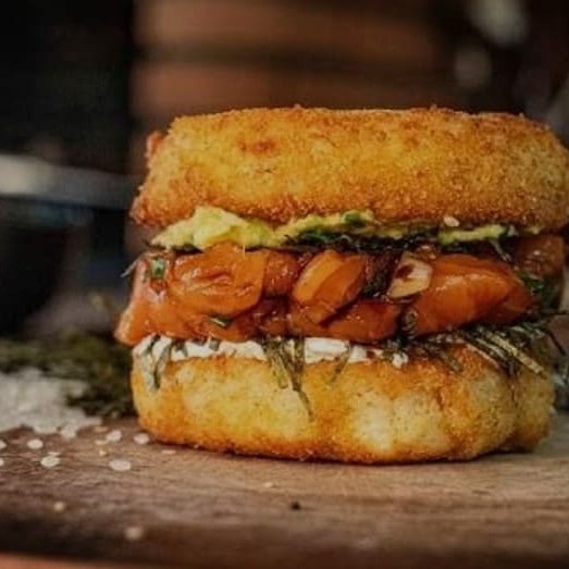 O 'Burger Salmão Grelhado' é uma surpreendente fusão de sabores. Começamos com nosso arroz gohan, delicadamente moldado e empanado na crocante farinha panko. Dentro, você encontrará um generoso recheio de suculento salmão grelhado, trazendo um toque de sofisticação e sabor único ao prato. Tudo isso é acentuado pela riqueza do creme cheese, que adiciona uma textura cremosa irresistível. Para finali