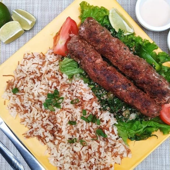 Dois espetos de kafta grelhado artesanal, preparado com carne fresca e temperos selecionados,acompanha arroz sirio e vinagrete.Uma explosão de sabores do Oriente médio em cada bocado !!