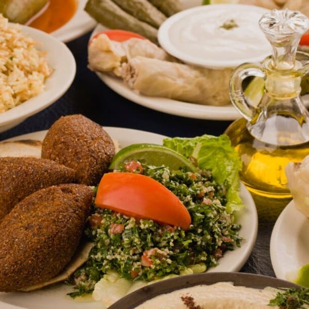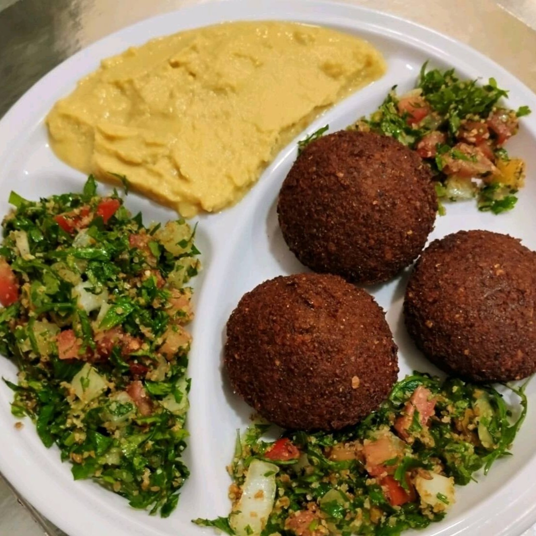 Kibe cru(100grs), coalhada seca (100 grs), mohamara(100 grs), fatuche(100 grs), tabule(100 grs),2 kibes fritos, 2 esfihas de carne fechada.