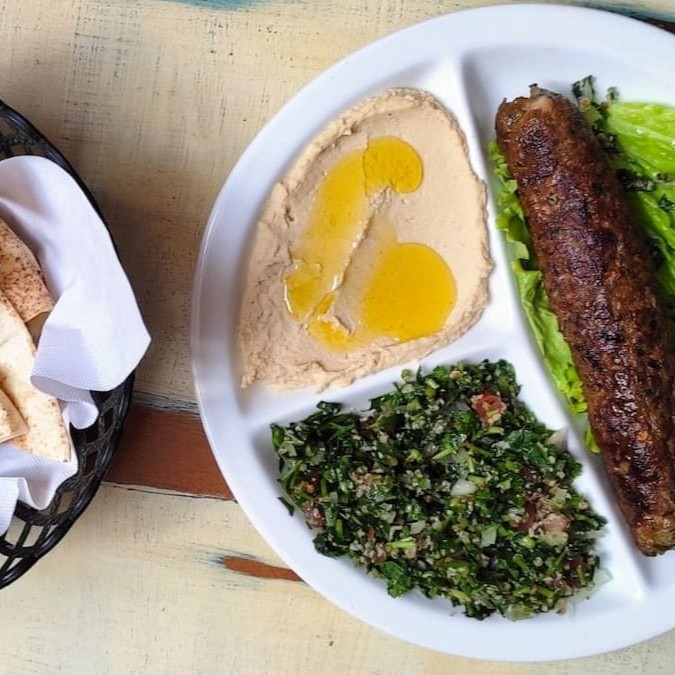 Um delicioso espeto de carne grelhada ,temperada com especiarias,acompanhada de homos pasta de grão de bico e tabule