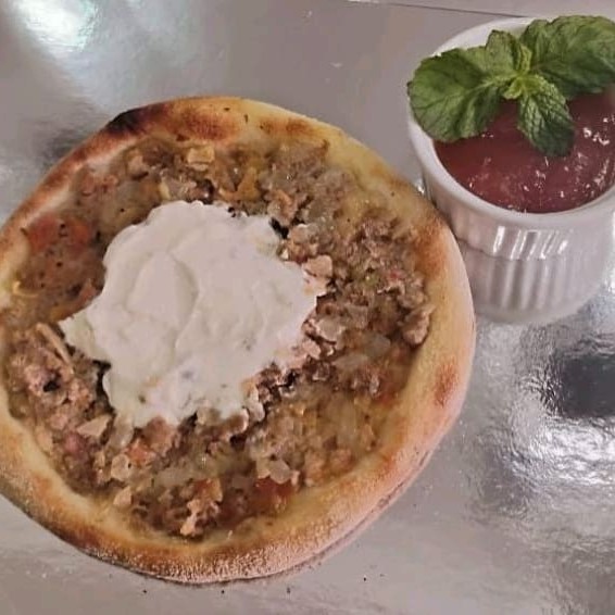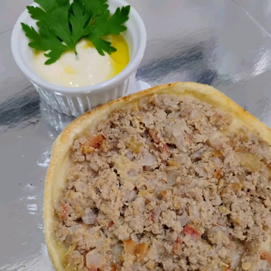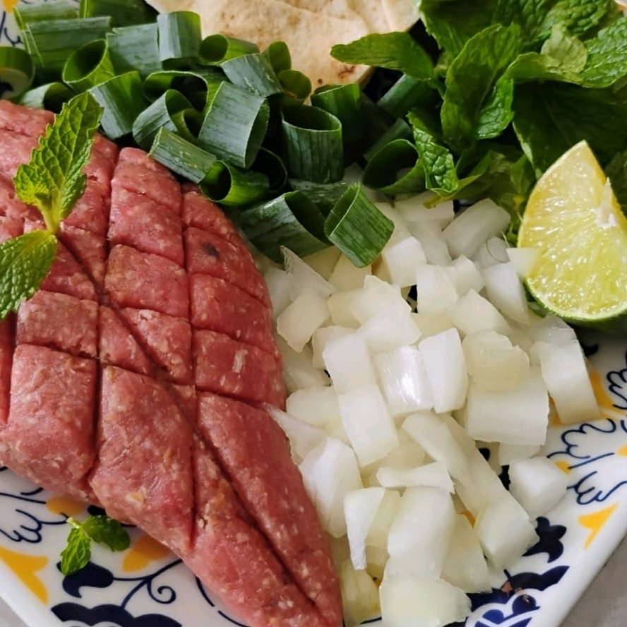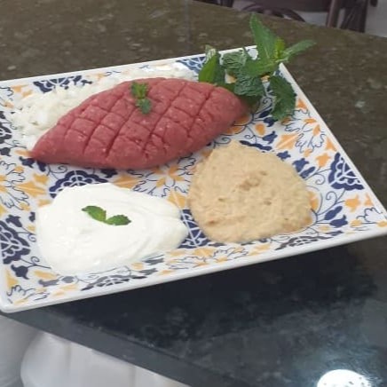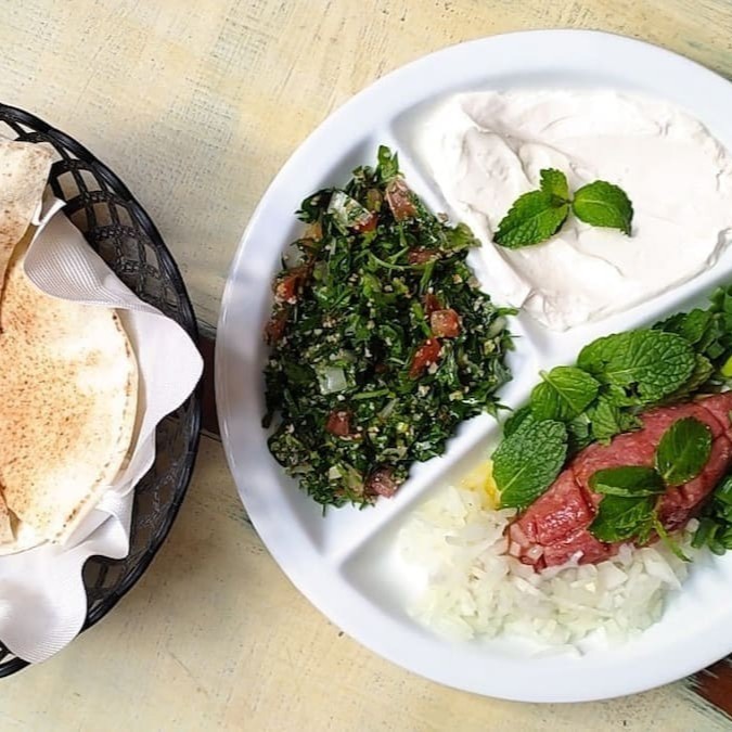 Desfrute do Nosso kibe cru,feito com carne de alta qualidade,temperado com especiarias libanesas,servido com coalhada cremosa e tabule refrescante,acompanha pão pita