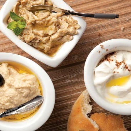 5 bolinhos de grão de bico +trio de pastas ,homos babaganoush e mohamara de pimentão vermelho ,acompanha pão sírio
