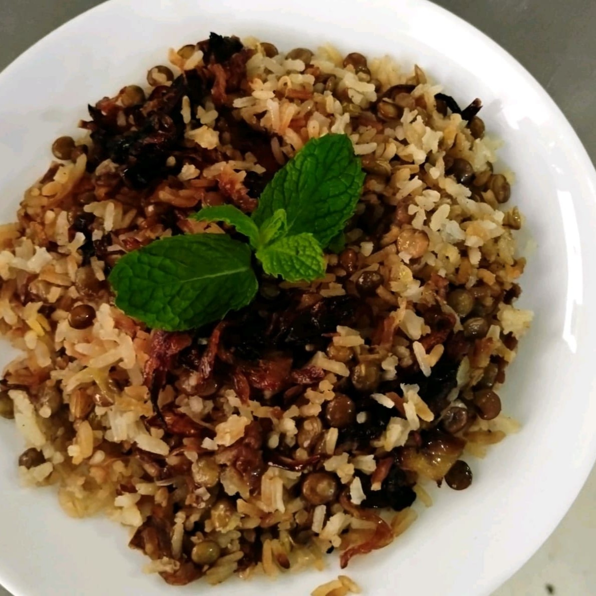 Arroz com lentilhas cebolas caramelizadas tudo temperado com especiarias