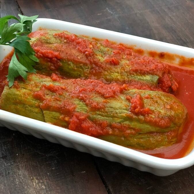 Desfrute da nossa abobrinha recheada,feita com abobrinha fresca,recheio de arroz e carne,temperada com especiarias,servida com um delicioso molho
