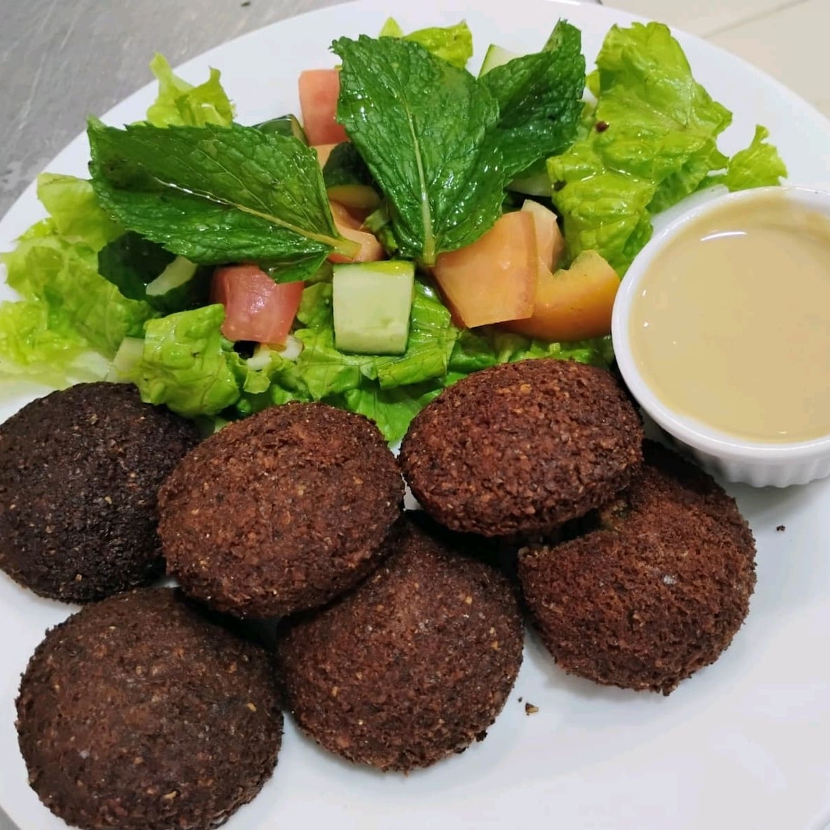 "Desfrute de nossa porção de falafel com salada,feita com grão de bico fresco,temperos orientais e servida com uma mistura de folhas verdes,tomate,pepino e molho tahine"""