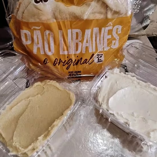Coalhada seca ,homos e pacote de pao sirio com 12 unidades ( 220 g de cada pasta)s