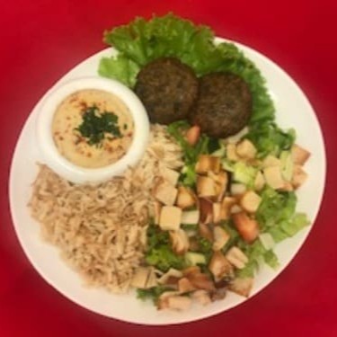 Falafel, fatuche, homus, arroz sírio.
