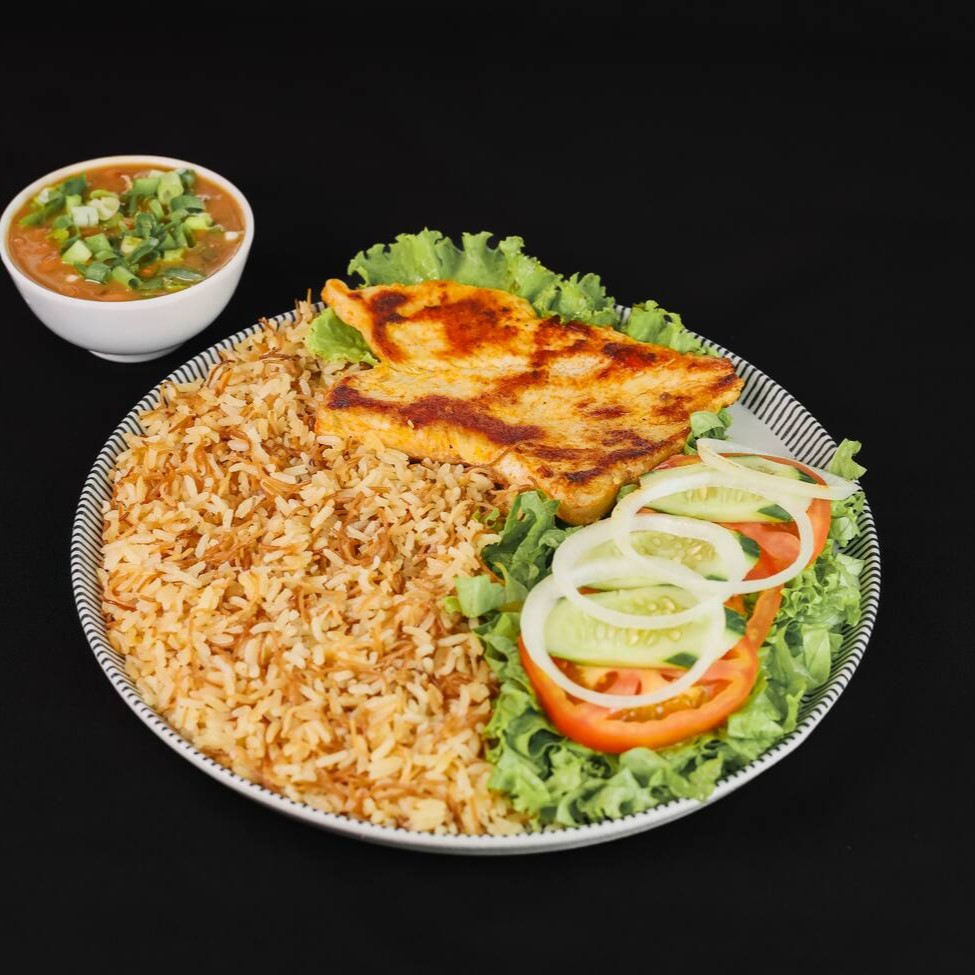 Cubos de frango, cebola e tomate. Acompanha arroz sírio.
