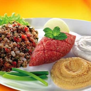 Coalhada 120 gr, kibe cru 120 gr e tabule 120 gr.