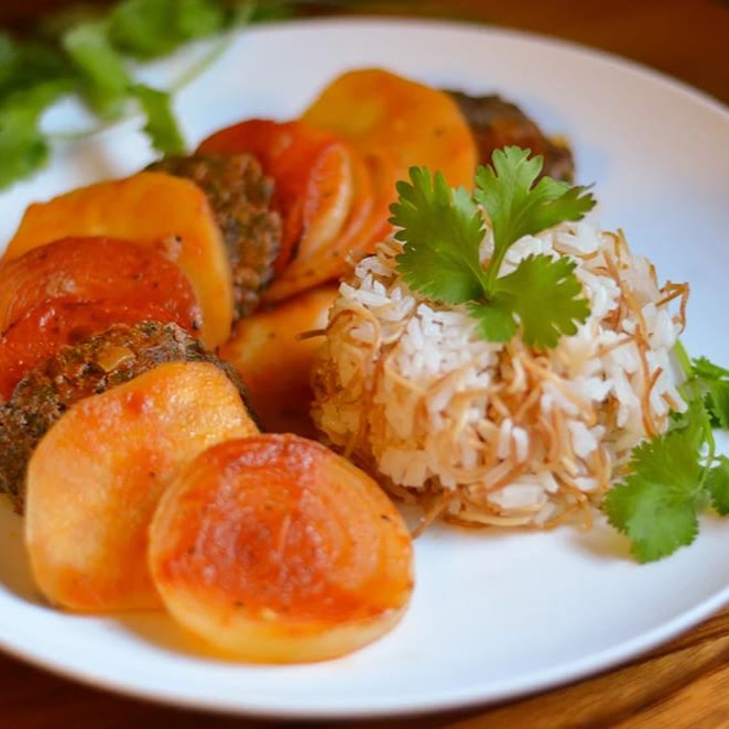 Kafta, charuto de uva, coalhada seca e arroz sírio.