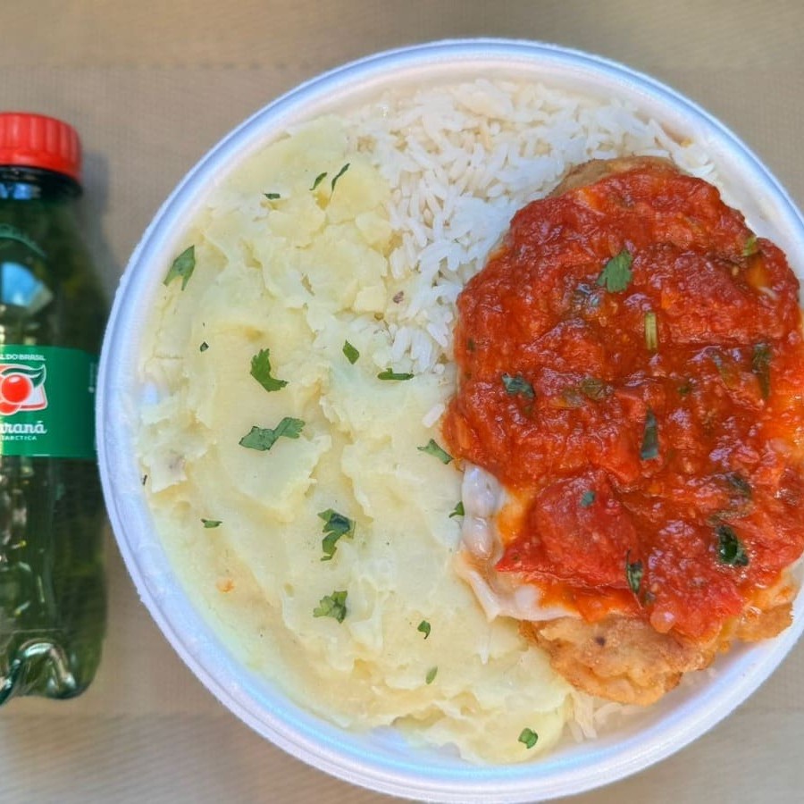 Marmita com delicioso filé de frango parmegiana (empanado na massa crocante coberto com molho de tomates e queijo) acompanhado de arroz branco e purê de batatas inglesas. Acompanha refrigerante pet Coca Cola bem gelado. Marmita indicada para 01 pessoa.